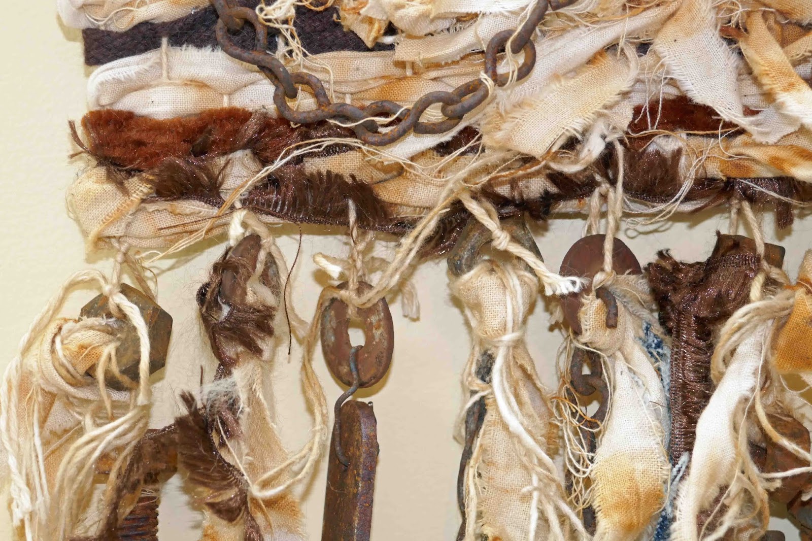 I added many metal pieces to this. I hung it from an old rusty drill bit and added an old chain to the front once I'd finished the weaving.